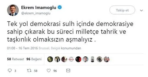 Saatler 01.08'i gösterirken tweet atıp "sulh içinde demokrasiye sahip çıkmak"tan söz eden, "tahrik ve taşkınlık olmasın" diyen (yani halkı evine sokmaya çalışan) biri İstanbul'a başkan yapılır mı?
