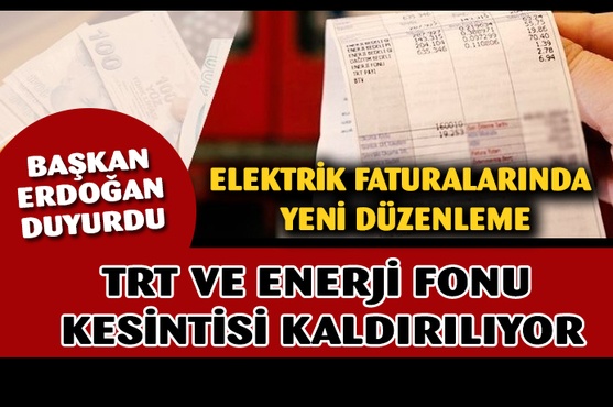 Kabine Toplantısı'nın ardından ulusa sesleniş konuşması yapan Başkan Recep Tayyip Erdoğan, elektrik faturalarındaki TRT payı ile Enerji Fonu kesintilerinin kaldırılacağını açıkladı. Başkan Erdoğan, "Önümüzdeki dönemde elektrik faturalarındaki TRT payı ile Enerji Fonu kesintilerini kaldırma kararı aldık." dedi.