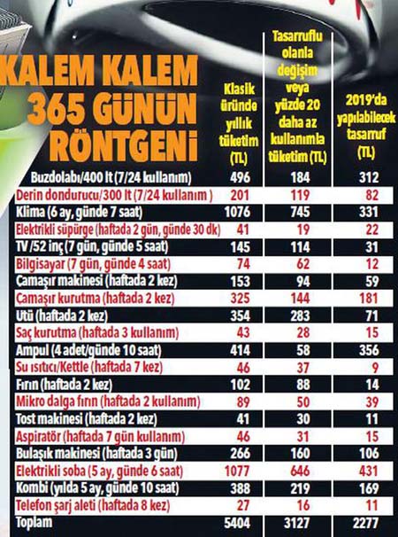 En küçük dokunuşta bile yıllık 356 lira cepte kalıyor. Bir başka örneği her gün çalışan buzdolabı üzerinden verelim. A sınıfı 400 litre hacimli bir buzdolabının faturaya yıllık yansıması 496 lirayı buluyor. Bu buzdolabının ‘A++’ olduğunu varsayarsak yıllık ödeme 184 liraya düşüyor. Bu örnekleri çoğaltmak mümkün. öncelikle bu ‘farkı’ farkedip paranızın cepte kalmasını sağlayacak harekete bir an önce geçmeniz gerekiyor.