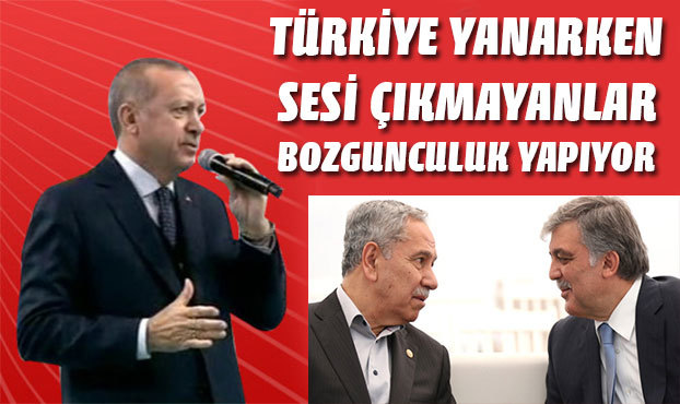 Erdoğan konuşmasında isim vermeden Abdullah Gül ve Bülent Arınç'ın KHK konusundaki eleştirilerine değinerek "Türkiye yanarken, insanlık inim inim inlerken sesi soluğu çıkmayanlar, bir anda sahaya inmeye, olur olmadık konuşmaya başladılar. Bu tepkisellik nereden çıktı. Biz saflarımızı sıklaştırırken bu bozgunculuk nedir. Bize yakışan birlik olmaktır, beraber olmaktır." şeklinde konuştu.