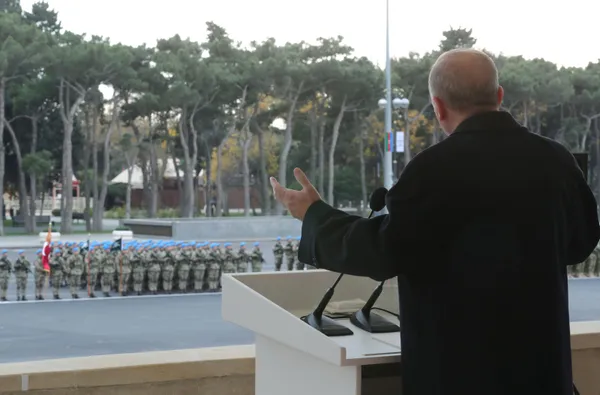 Erdoğan konuşmasında "30 yıllık aradan sonra Karabağ ile Azerbaycan halkı ile buluşturan kutlu neferleri tebrik ediyor, onları cepheye gönderen anaların ellerinden öpüyorum" dedi.