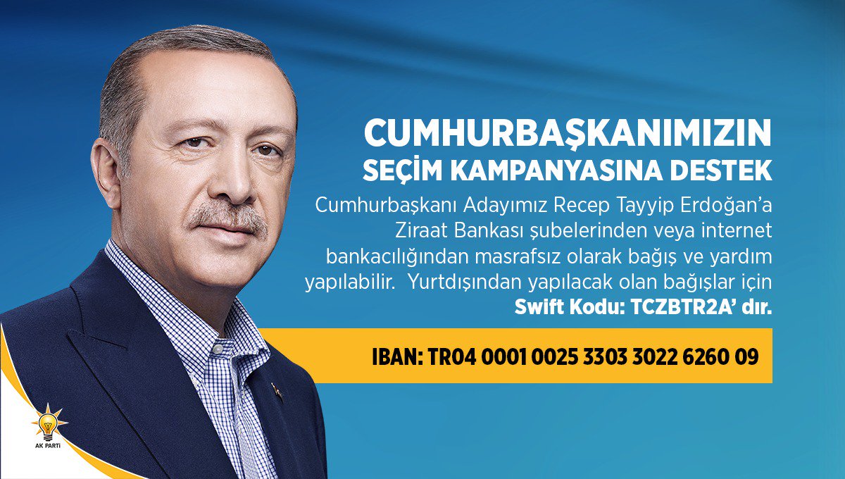 AK Parti'nin sosyal medya hesaplarından "Cumhurbaşkanımızın Seçim Kampanyasına Destek" başlığıyla yapılan paylaşımda, bağış ve yardımların hangi şartlar altında ve nerelere yapılabileceği hakkında bilgi verildi.