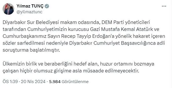 Adalet Bakanı Yılmaz Tunç sosyal medya hesabından yaptığı açıklamada, DEM Parti yöneticilerinin Diyarbakır Sur'daki mazbata töreni sırasında Gazi Mustafa Kemal Atatürk ve Başkan Recep Tayyip Erdoğan'ın fotoğraflarına yönelik hakaret içeren sözlerle ilgili Diyarbakır Cumhuriyet Başsavcılığınca adli soruşturma başlatıldığını duyurdu. Bakan Tunç açıklamasında şu ifadeleri kullandı: