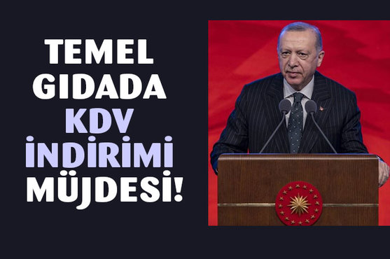 Erdoğan, ""KDV Sistemini Sadeleştirme Programımız kapsamında temel gıda ürünlerinde yüzde 8 olan KDV'yi yüzde 1'e indiriyoruz. KDV'si yüzde 1'e inen ürünler, enflasyon sepetinde ciddi bir ağırlığa sahiptir." diye konuştu.