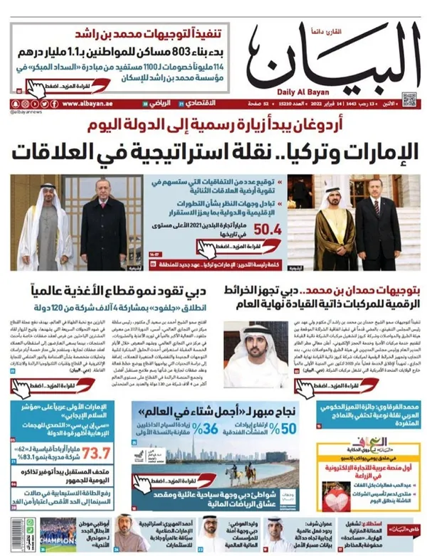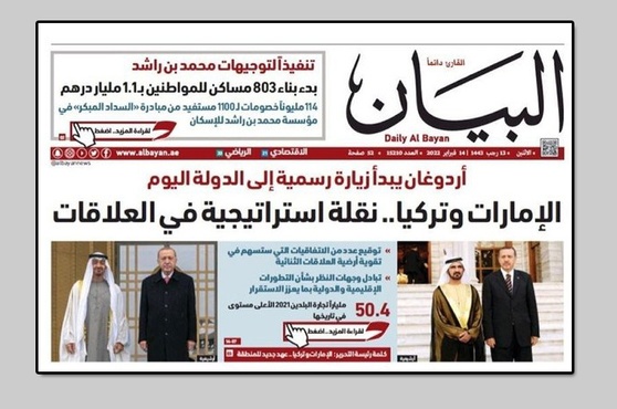 Cumhurbaşkanı Erdoğan'ın BAE ziyaretinin stratejik ilişkileri güçlendirme ve daha ileri bir düzeye taşıma yolunda önemli bir adım olduğunu vurgulayan gazete, Abu Dabi Veliaht Prensi Şeyh Muhammed bin Zayid Al Nahyan'ın Ankara ziyaretinin de Türkiye-BAE ilişkilerinin başta ekonomi olmak üzere birçok alanda gelişmesi açısından önemli bir başlangıç teşkil ettiğini belirtti.