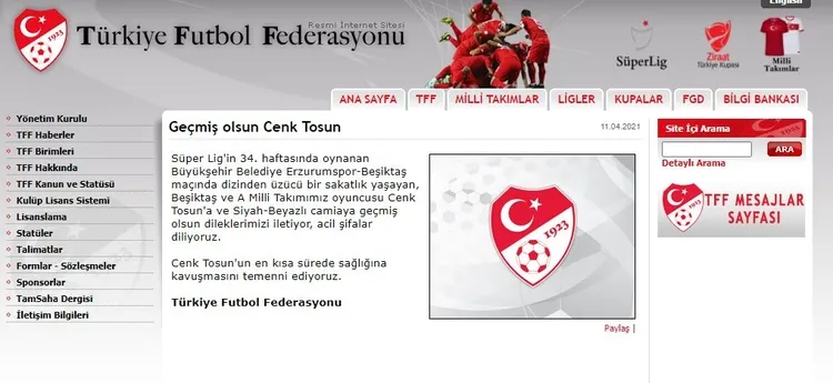 TFF'den: "Dizinden üzücü bir sakatlık yaşayan Beşiktaş ve A Milli Takımımız oyuncusu Cenk Tosun'a ve Beşiktaş camiasına geçmiş olsun dileklerimizi iletiyor, acil şifalar diliyoruz. Cenk Tosun'un en kısa sürede sağlığına kavuşmasını temenni ediyoruz."