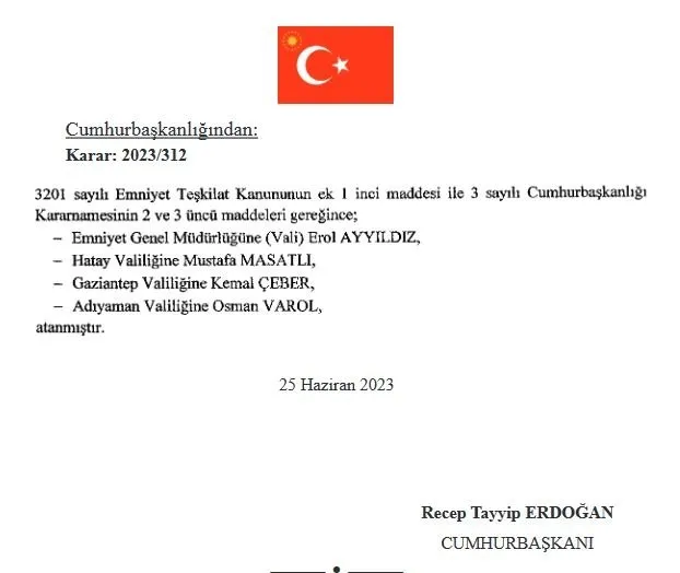 Başkan Recep Tayyip Erdoğan'ın Emniyet Genel Müdürlüğü'ne ilişkin atama kararları Resmî Gazete'de yayımlandı.