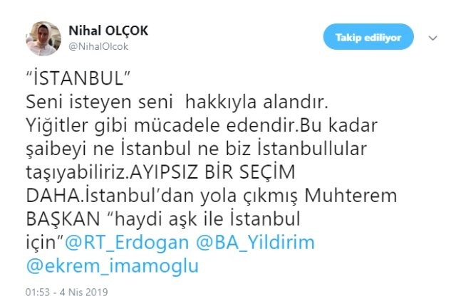 Paylaşımında Cumhurbaşkanı Erdoğan, Binali Yıldırım ve Ekrem İmamoğlu'nu etiketleyen Olçok, "İstanbul, seni isteyen seni hakkıyla alandır. Yiğitler gibi mücadele edendir. Bu kadar şaibeyi ne biz, ne İstanbullular taşıyabiliriz. Ayıpsız bir seçim daha" ifadelerini kullandı.