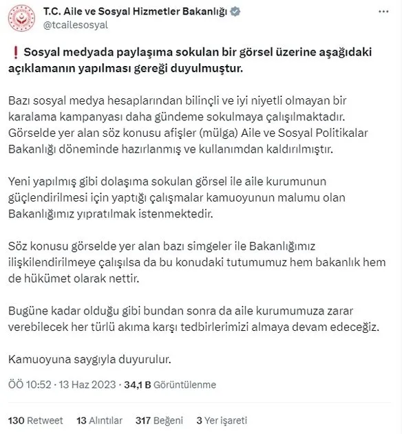 "Yeni yapılmış gibi dolaşıma sokulan görsel ile aile kurumunun güçlendirilmesi için yaptığı çalışmalar kamuoyunun malumu olan Bakanlığımız yıpratılmak istenmektedir. Söz konusu görselde yer alan bazı simgeler ile Bakanlığımız ilişkilendirilmeye çalışılsa da bu konudaki tutumumuz hem bakanlık hem de hükümet olarak nettir. Bugüne kadar olduğu gibi bundan sonra da aile kurumumuza zarar verebilecek her türlü akıma karşı tedbirlerimizi almaya devam edeceğiz."