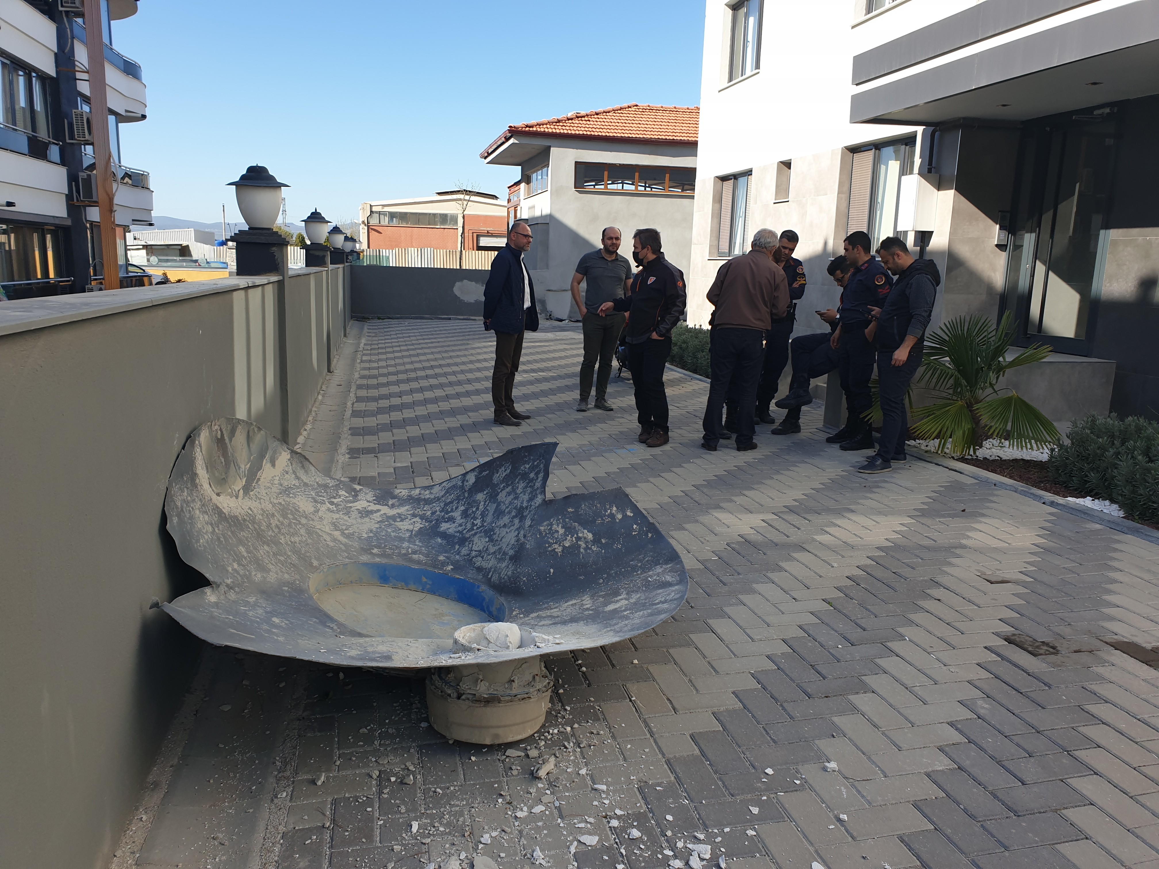 Olay anında çok korktuklarını söyleyen site sakinlerinden Sefa Altıngövde, "İki tane büyük patlama oldu. Patlama sonrasında tabi çimentolarla beraber büyük bir toz bulutu havaya kalktı. Sonrasında da buraya büyük bir parça düştü. Burası fabrikaların ve yaşam alanının olduğu bir yer. Fabrikanın ihmali midir bilmiyoruz. Ama fabrikadan büyük bir parça sitemize düştü. Bu alan da çocukların oyun oynadığı bir alan. Burada sadece bu değil, fabrikaların oluşturduğu toz, kir ve aynı zamanda da can güvenliğine yönelik tehlikelerden şikayetçiyiz. Site sakinleri olarak mağduruz. Çok ağır bir parçaydı. İnsanların taşıyamayacağı bir parçaydı ki iş makineleriyle taşıdılar. Çok ağır bir parçaydı. 5 dakika öncesinde de sitede çocuklar oyun oynuyorlardı. Burada kimsenin zarar görmemesi büyük bir şans. Düşen parça yere zarar verdi ki insanları öldürebilecek ağırlıktaydı. Araçlara ya da eve gelse ciddi zararlar verebilirdi" dedi.