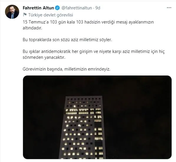 "15 Temmuz'a 103 gün kala 103 hadsizin verdiği mesaj ayaklarımızın altındadır. Bu topraklarda son sözü aziz milletimiz söyler. Bu ışıklar antidemokratik her girişim ve niyete karşı aziz milletimiz için hiç sönmeden yanacaktır. Görevimizin başında, milletimizin emrindeyiz."