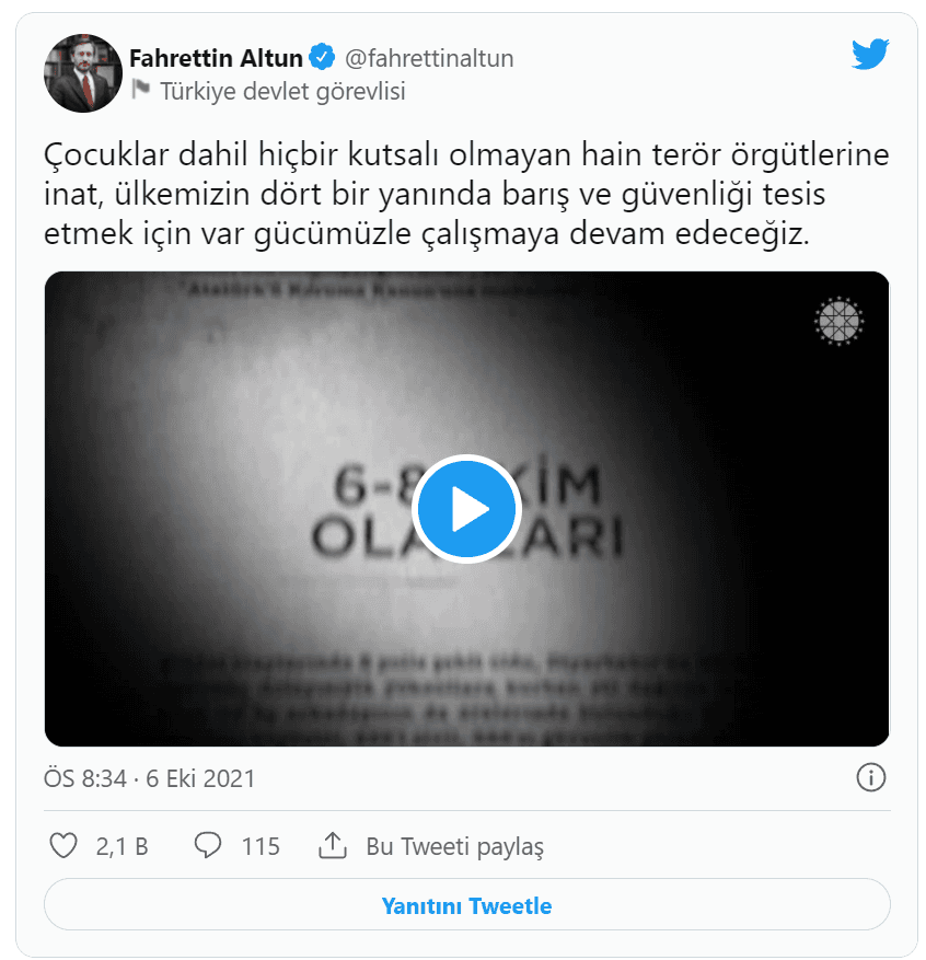 Altun, Cumhurbaşkanlığı İletişim Başkanlığınca, "6-8 Ekim Olayları"nın 7. yılı dolayısıyla hazırlanan videoyu sosyal medya hesabından paylaştı.