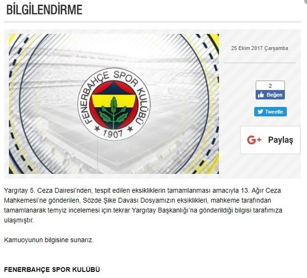 "Yargıtay 5. Ceza Dairesi'nden, tespit edilen eksikliklerin tamamlanması amacıyla 13. Ağır Ceza Mahkemesi'ne gönderilen, Sözde Şike Davası Dosyamızın eksiklikleri, mahkeme tarafından tamamlanarak temyiz incelemesi için tekrar Yargıtay Başkanlığı'na gönderildiği bilgisi tarafımıza ulaşmıştır."
