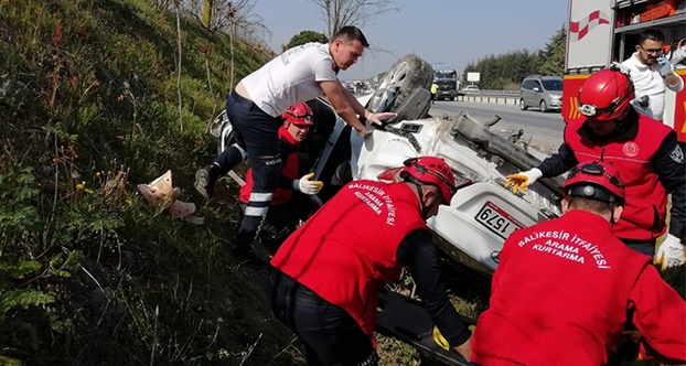 Balıkesir'den İzmir istikametine gitmekte olan özel bir araç direksiyon hakimiyetini kaybederek refüje yuvarlandı. Meydana gelen kaza sonrasında araç içinde bulunan 4 kişi sıkıştı. Balıkesir İtfaiyesi olay yerinde yaptığı çalışmada araçta bulunan 4 kişiyi sıkıştıkları yerden kurtardı. Araçta bulunan 77 yaşındaki Nurten B.'nin hayatını kaybettiği belirlendi. Araçtan çıkarılan yaralılar en yakın hastaneye sevk edilirken, olayla ilgili soruşturma başlatıldığı öğrenildi.