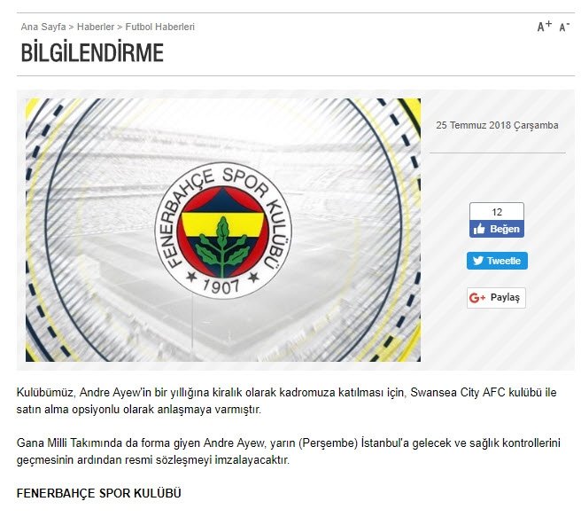 Fenerbahçe Kulübü, Andre Ayew'i satın alma opsiyonuyla bir yıllığına kiraladığını dün gece geç saatlerde kamuoyuna duyurdu. Resmi internet sitesinden yapılan açıklamada şu ifadeler kullanıldı: "Kulübümüz, Andre Ayew'in bir yıllığına kiralık olarak kadromuza katılması için, Swansea City AFC kulübü ile satın alma opsiyonlu olarak anlaşmaya varmıştır. Gana Milli Takımı'nda da forma giyen Andre Ayew, yarın (bugün) İstanbul'a gelecek ve sağlık kontrollerini geçmesinin ardından resmi sözleşmeyi imzalayacaktır."