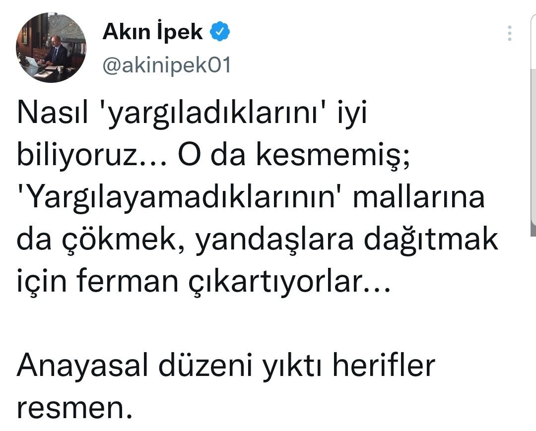 "Nasıl 'yargıladıklarını' iyi biliyoruz... O da kesmemiş; 'Yargılayamadıklarının' mallarına da çökmek, yandaşlara dağıtmak için ferman çıkartıyorlar... Anayasal düzeni yıktı herifler resmen."