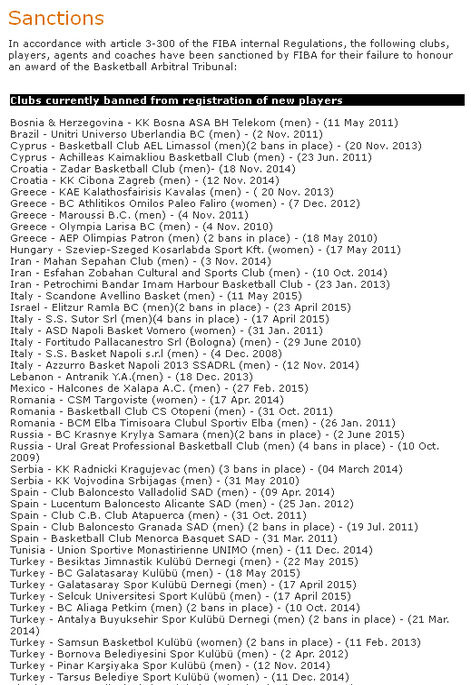 FIBA’nın resmi internet sitesi aracılığıyla yapılan açıklamaya göre, Türkiye Basketbol Ligi (TBL) ekiplerinden Galatasaray, Beşiktaş ve Karşıyaka'ya oyuncularına ve menajerlere eksik ödemeler yapılmasından dolayı transfer yasağı getirildi. 3 kulübün yanı sıra faaliyetlerine devam etmeyen Selçuk Üniversitesi, Aliağa, Samsun Basketbol, Bornova Belediye, Antalya BŞB ve Tarsus Belediye de transfer yasağı alan ekipler oldu.