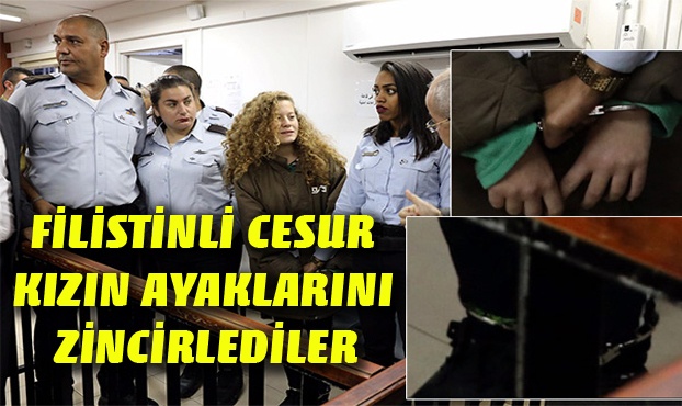 Filistinli cesur kız Ahed Temimi'nin gözaltı süresi 5 gün uzatılırken, İsrail polisi duruşmaya getirdiği 16 yaşındaki kızın ayaklarına zincir bağladı.