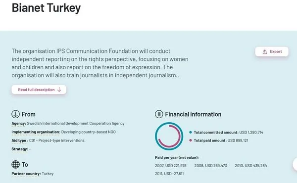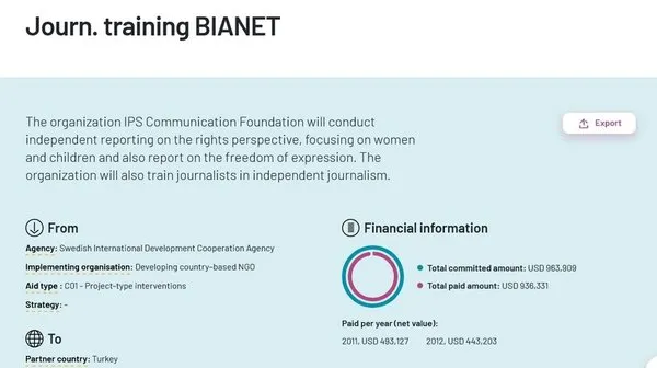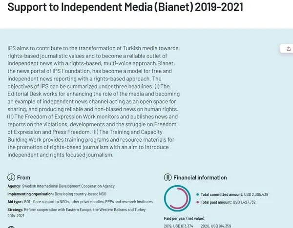 İsveç Uluslararası Kalkınma İşbirliği Ajansı'nın, Bianet adlı internet sitesine 2019 ve 2020 yılları arasında 1 milyon 427 bin 733 dolar fonladığı bildirildi. Ajansın, Bianet yöneticilerine 2019 yılında 613 bin 374 dolar ve 2020 yılında 814 bin 359 dolar hibede bulunduğu öğrenildi.