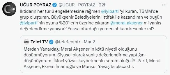 İYİ Parti Genel Sekreteri Uğur Poyraz, Merdan Yanardağ'ın sözlerini alıntılayarak, "Oturduğunuz yerden ahkam kesiyorsunuz." dedi. Her türlü engellemelere rağmen Akşener'in İYİ Parti'yi kurduğunu dile getiren Poyraz, "TBMM'de grup oluşturan, Büyükşehir Belediyelerini ittifak ile kazandıran ve bugün İYİ Parti'nin oyunu %20'lerin üzerine çıkaran Meral Akşener mi yanlış değerlendirme yapıyor? Yoksa oturduğu yerden ahkam kesenler mi?" ifadelerini kullandı.