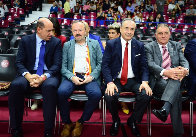 Galatasaray Başkanı Mustafa Cengiz, FIBA Avrupa Başkanı Turgay Demirel, FIBA Avrupa İkinci Başkanı Cyriel Coomans, Galatasaray yöneticileri Okan Böke, Prof. Dr. Nejat Güney, Ömer Cansever, Mahmut Recevik ve Erol Özmandıracı, Sportif AŞ Yönetim Kurulu Üyesi Yusuf Günay ile Palasport Taliercio'da...