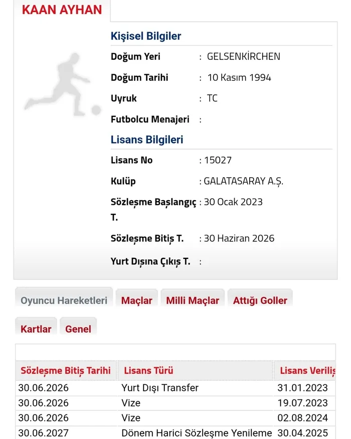 Galatasaray, Kaan Ayhan'ın sözleşmesinin uzatıldığını TFF'ye bildirdi.