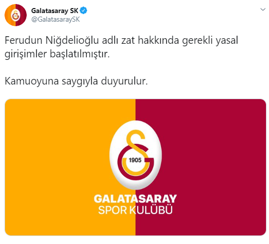 Eski fanatik Fenerbahçe muhabiri olan şimdilerde TRT Spor'da yayınlanan 'Basın Merkezi' programına yorumcu olarak katılan Ferudun Niğdelioğlu'nun açıklamaları tartışmaya neden oldu ! 15 Temmuz destanının üçüncü yılında Atatürk Havalimanı'nda yapılan anma törenine Galatasaray'ı temsilen kimsenin katılmadığını belirten Niğdelioğlu'yla ilgili sarı-kırmızılı kulüp yasal işlem başlatıldığını açıkladı.