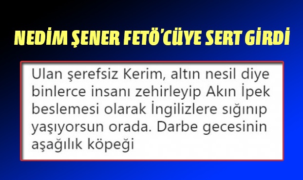 Posta gazetesi yazarı Nedim Şener, "Ulan şerefsiz Kerim, altın nesil diye binlerce insanı zehirleyip Akın İpek beslemesi olarak İngilizlere sığınıp yaşıyorsun orada. Darbe gecesinin aşağılık köpeği, Kerim itinin arkadaşı, şerefsiz Fetö’cü, Köpek dostları kızmasın zira köpekler dostluğu ve sadakatıyla bilinir. Kırılanlardan özür dilerim. Ama bir Fetö’cü ailesini vatanını satan aşağılık bir yaratıktır, bazıları da bunun gibi İngiliz ajanıdır." paylaşımlarıyla FETÖ'cülere cevap verdi.