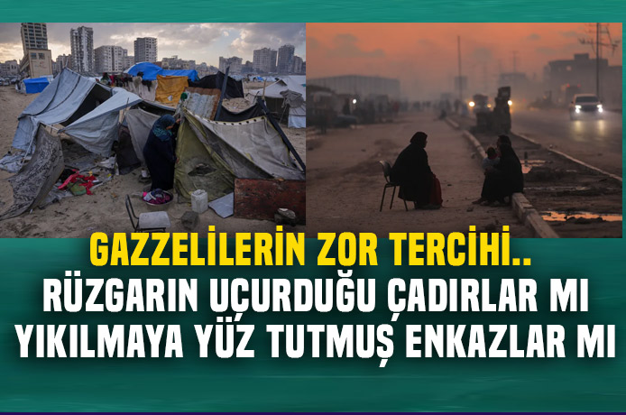 Gazze'deki Filistinliler bu kış imkansız bir seçimle karşı karşıya. Savaşta 400.000'den fazla evin yıkılmasıyla, Gazzeliler ya açık havada çadırlarda yaşamak ya da her an çökecek binaların enkazında yaşama riskini göze almak arasında seçim yapmak zorunda kalıyorlar.