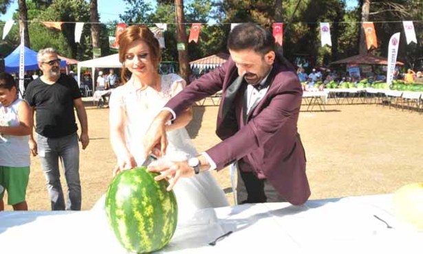 Alikale Turistlik Tesisleri’nde düzenlenen Kavun Karpuz Festivali’ne katılan Gülcan Başer ve Ümit Yüksel çiftti pasta yerine karpuz kesti. Belediye Başkanı Hamit Kılıç, genç çiftin nikah defterini Gülşen Başar’e verdi. Başkan Kılıç, “Gelin ve damat kardeşimiz bugün pasta kesmek yerine kavun ve karpuz kesmeyi tercih ederek bize sürpriz yaparak farklı anılar yaşattılar. Kendilerine teşekkür ediyorum” dedi. Genç çiftti tebrik eden Başkan Kılıç, nikah defterini gelin Gülcan Başer’e verdi. Damat Ümit Yüksel’e de altın takarak mutluluklar diledi.