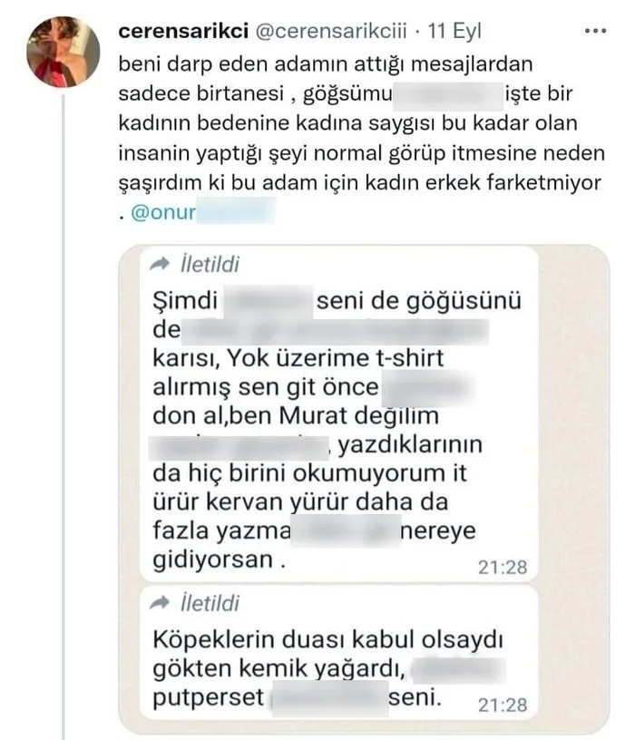 İhlas Haber Ajansı'na konuşan Ceren Sarıkçı, Onur K.'nin kendisinin cep telefonuna takip cihazı dahi yüklediğini iddia ederek, "Sık sık bana geçmişimde hiçbir şey yaşamadığım halde bana yaşamadığım şeyleri sapkınlık derecesinde anlattırmaya çalışırdı. En son 17 Mart tarihinde bana cinsel istismarda bulundu ve sol göğsüme tırnaklarını geçirip parçaladı. Benim çığlıklarıma insanlar koştu. Ambulans ile hastaneye kaldırıldım. Darp raporu aldım ve ardından tehdit edildiğim için karakolda 'şikayetçi değilim' dedim" ifadelerini kullandı.