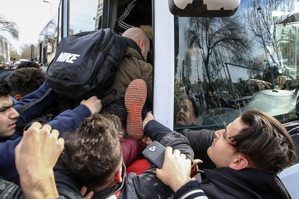 Göçmenler otobüslere binmek için adeta birbirlerini ezdi.