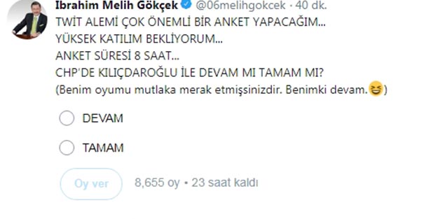 Takipçilerine 8 saat süre veren Gökçek, sosyal medya kullanıcılarına 'CHP'de Kılıçdaroğlu ile devam mı, tamam mı? diye sordu.