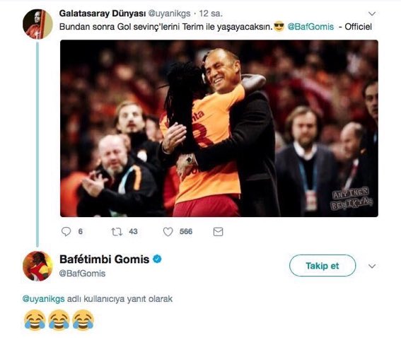 Twitter'da Igor Tudor ile gol sevincine photoshop ile Fatih Terim'in kafasını koyup fotoğrafı paylaşan ve 'Bundan sonra gol sevinçlerini Terim ile yaşayacaksın' yazan bir taraftara Gomis gülerek cevap verdi.