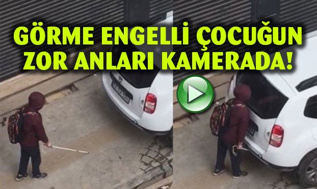 Görme engelli olduğu öğrenilen çocuğun, hissedilebilir zeminde (görme engelli yürüme yolu) elindeki değnekle ilerlemeye çalışırken, kaldırıma hatalı park eden araca başını çarpıyor.