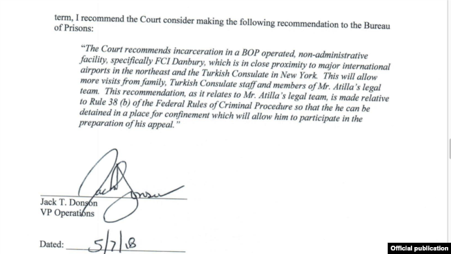 Raportör Donson, mahkemeye sunduğu raporun son bölümünde hakimden kararında tavsiyelerini dikkate almasını isteğini belirterek, “Atilla’nın, çok daha az güvenlikli olan FCI Danbury Hapishanesine (New York’a komşu eyalet Connecticut’a bağlı bir kent) nakledilmesini Cezaevleri Bürosuna önerin. Burada Kuzeydoğu eyaletlerine yakın birçok uluslararası havaalanı var. Ayrıca New York’taki Türk Başkonsolosluğuna yakın. Bu şekilde hem savunma avukatları, konsolosluk yetkilileri, hem de ailesi daha fazla ziyaret edebilir. Atilla, daha uygun olan şartlarda hakkındaki kararı bir üst mahkemeye taşıyıp temyiz etmek için elverişli koşullar altında çalışabilir” dedi.