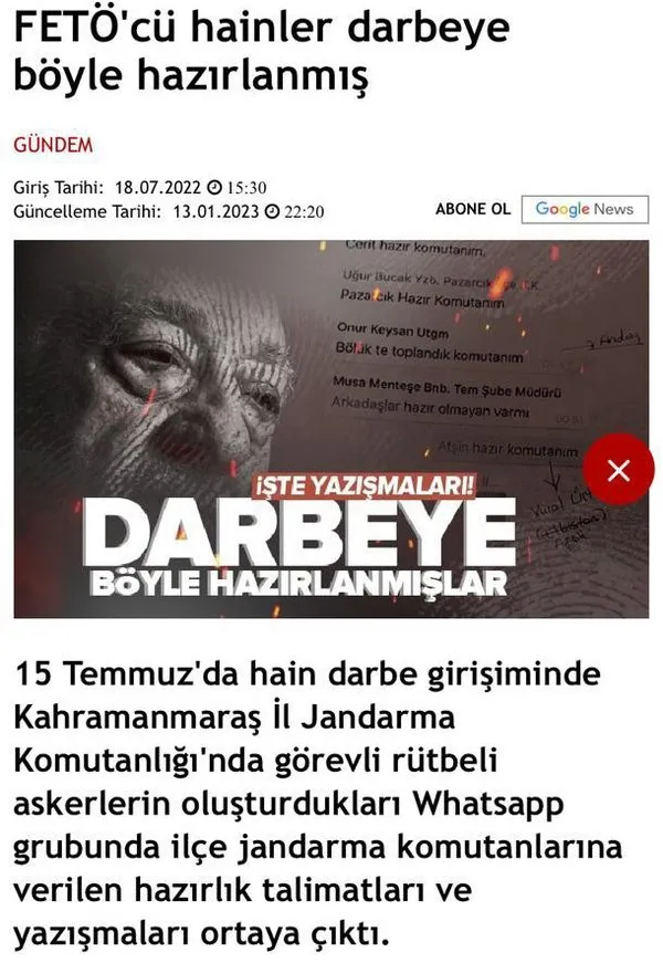 Darbecileri sevindiren karara imza atan Kastamonu Sulh Ceza Hakimliği, 15 Temmuz'da hain darbe girişiminde Kahramanmaraş İl Jandarma Komutanlığı'nda görevli rütbeli askerlerin oluşturdukları WhatsApp grubunda ilçe jandarma komutanlarına verilen hazırlık talimatları ve yazışmaların yer aldığı haberin diğer internet sitelerinde de yer alması nedeniyle aynı haberin paylaşımlarına da erişim engeli kararı aldı.