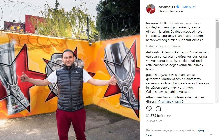 Instagram hesabından bir fotoğraf ve mesaj paylaşan Hasan Şaş, "Ben Galatasaray'ımın hem içindeyken hem de dışındayken iyi yerlerde olmasını isterim. Bu düşüncede olmayan kendini Galatasaraylı sanan aciz insanlar tarihe hesap verecektir. Şüpheniz olmasın.." ifadelerini kullandı.