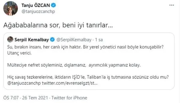 Bunun üzerine HDP İzmir Milletvekili Serpil Kemalbay, Özcan'a tepki gösterdi ve "Bir yerel yönetici nasıl böyle konuşabilir? Utanç verici" dedi. Kemalbay'ın bu açıklamasına sessiz kalmayan Özcan ise "Ağababalarına sor, beni iyi tanırlar" ifadelerini kullandı. Öte yandan HDP Eş Genel Başkanı Mithat Sancar da "Irkçılık kabul edebileceğimiz bir şey değil" diyerek Özcan'a tepki gösterdi.
