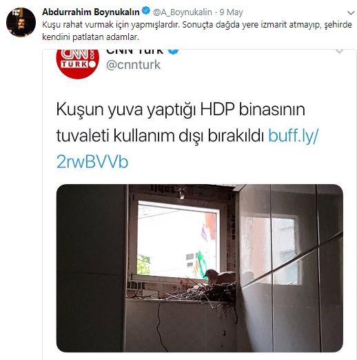Yıllardır PKK’lı teröristlerin asker ve sivil gözetmeksizin düzenlediği alçak saldırılara tek kelime etmeyen ve hatta saldırıları kınama cesareti bile gösteremeyen HDP’nin insan hayatına verdiği değer apaçık ortadayken, partililerin söz konusu tuvaleti ‘hayvan hayatına karşı duyarlılık’ söylemiyle kapatması HDP’nin ikiyüzlü yüzünü bir kez daha ortaya çıkardı. HDP’nin bu tavrı sosyal medyada büyük tepki toplarken, Gençlik ve Spor Bakan Yardımcısı Abdurrahim Boynukalın, yayınladığı mesajında, “Kuşu rahat vurmak için yapmışlardır. Sonuçta dağda yere izmarit atmayıp, şehirde kendini patlatan adamlar.” İfadelerini kullandı.