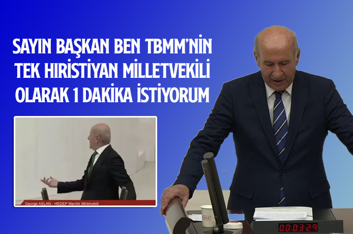 TBMM Genel Kurulu'nda ilginç anlar yaşandı. DEM Parti Mardin Milletvekili George Aslan, konuşma yaptığı sırada, ek süre talep ederek, "Sayın başkan 1 dakikayla tamamlamam mümkün değil. 600 Müslüman milletvekili içinde bir Hristiyan milletvekiliyim. Dertlerimiz de çok. Lütfen 1-2 dakika ek süre rica edeceğim." dedi.