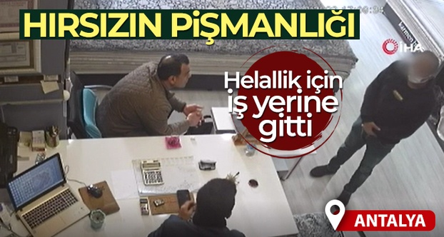 Görüntülerin devamında ise hırsızlık olayından 1 ay sonrası tekrar işyerine gelen şüphelinin iş yeri sahibinden af dileyip helallik istemesi yer aldı. Yaşanan diyaloglarda ise dizüstü bilgisayarı çaldığını kabul eden ancak cep telefonunu çalmadığını savunan hırsızlık şüphelisinin, “Kusura bakamayın özür dilerim. Geçen bir hırsızlık olmuştu. Onun sorumlusu benim. Pişman oldum. Bilgisayarı 550 liraya sattım. Cep telefonunu ben almadım” sözleri ile Mustafa Demir'in de buna karşılık olarak 15 bin lira zararı olduğunu belirtmesi yer aldı. Şüphelinin ise buna karşılık, “Durumum yok. Malulen emekliyim, mahkemeye söyleyin abi gereken neyse cezam verilsin. Kendimi kaybettim. Helallik almaya geldim. Pişmanım, sen hakkını helal ettikten sonra ben de sana dua ederim” diyerek iş yeri sahibinin elini öpmeye çalıştığı görüldü.