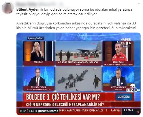 Skandallarıyla gündemden düşmeyen HaberTürk Ankara Temsilcisi Bülent Aydemir, Van'da yaşanan ve 41 insanımızın hayatını kaybettiği çığ felaketinden Cumhurbaşkanı Başdanışmanı Gülşen Orhan'ı sorumlu tuttu. Yalanın ortaya çıkmasının ardından Aydemir'e çok sayıda tepki yağdı.