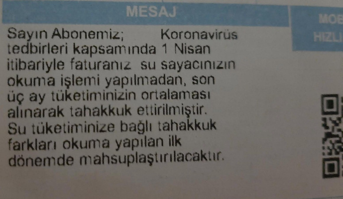 Koronavirüsün ülkemizi etkisi altına almasının ardından ilk gelen su faturasında İstanbulluların dikkatini faturanın altında yazan yazı çekti. Faturanın altına düşülen notta, "Sayın abonemiz koronavirüs tedbirleri kapsamında 1 Nisan itibariyle faturanız su sayacınızın okuma işlemi yapılmadan, son üç ay tüketiminizin ortalaması alınarak tahakkuk ettirilmiştir. Su tüketiminize bağlı tahakkuk farkları okuma yapılan ilk dönemde mahsuplaştırılacaktır." ibaresi düşüldü. Yani İstanbul Büyükşehir Belediyesi, şu anki faturalarda almadığı bedeli okuma yapılan ilk faturada alacağını not düştü. Faturalardaki detayı gören vatandaşlar, Ekrem İmamoğlu'na tepki göstererek "Bu durumda bari kurnazlık yapma" dedi.