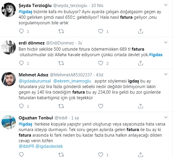 Öte yandan geçtiğimiz günlerde İstanbulluların doğalgaz faturalarında da kurnazlık yapıldığı ortaya çıkmıştı. İGDAŞ tarafından ortalama gönderileceği söylenen doğalgaz faturaları, vatandaşların son 3 ayda ödediği fatura ortalamasının çok üzerinde gönderildiği tespit edilmişti. Fırsatçılığın ortaya çıkması sonrası sosyal medyada İBB'ye ve İGDAŞ'a tepki yağmıştı.