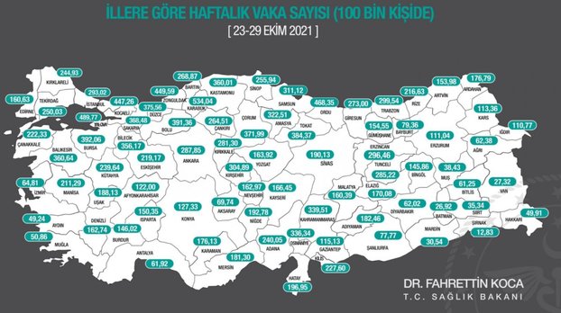 Sağlık Bakanı Fahrettin Koca, 23-29 Ekim'de illere göre her 100 bin kişide görülen koronavirüs vaka sayılarını açıkladı.