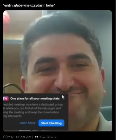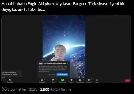 Görüntüler kısa sürede sosyal medyada gündem olurken, toplantıya katılan Engin Altay'ın arka fonunun "uzay" görüntüsü olması dikkatlerden kaçmadı. Onursal Adıgüzel'in Altay'a "Engin abi yine uzaydasın" diye seslenmesi ise sosyal medyada ti'ye alındı. Öte yandan toplantıdaki gizemli katılımcının kim olduğu ise merak konusu oldu.