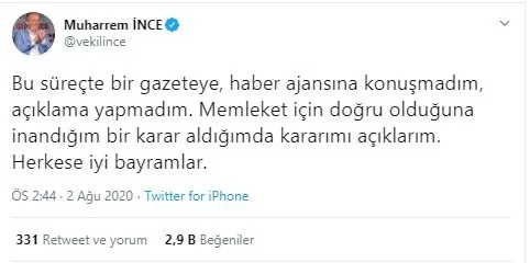 Bu süreçte bir gazeteye, haber ajansına konuşmadım, açıklama yapmadım. Memleket için doğru olduğuna inandığım bir karar aldığımda kararımı açıklarım. Herkese iyi bayramlar.