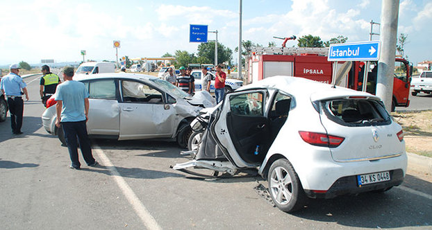 Edinilen bilgiye göre kaza, İpsala ilçesi girişinde bulunan kavşakta meydana geldi. Yenikarpuzlu beldesi-İpsala istikametinde seyreden Murat Aydın yönetimindeki 34 KS 0448 plakalı araca, ilçenin girişinde bulunan kavşağa geldiği esnada, İpsala Gümrük Kapısı-Keşan yönünde seyreden Laftsis Grigorios idaresindeki Yunanistan plakalı EBK-6335 plakalı araç çarptı. Kazada sürücüler Murat Aydın ile Laftsis Grigorios, araçlarda bulunan Sema Bilir Aydın ve Bastianu Kaliogi yaralandı. Yaralılar olay yerine gelen ambulanslarla Keşan Devlet Hastanesine kaldırılarak tedavi altına alındı. Kazayla ilgili soruşturma başlatıldı.