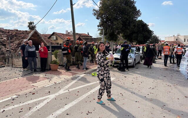 İran'ın Beit Shemesh'e düzenlediği füze saldırısının ardından, 1 Mart 2026'da, perişan haldeki birYahudi köpeğini sokak ortasında tutuyor. (Sam Sokol/Times of Israel)